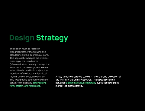 Beyond narrative, resonance also informed the logic of the visual identity system. The repetition of the letter “R” in Mokarrar (and «ر» in Persian) naturally evokes rhythm, continuity, and reinforcement. This repetition became a conceptual bridge between meaning and form translating the idea of ongoing transformation into a tangible visual language.